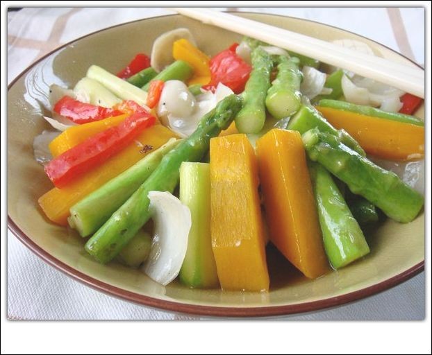 原料:新鲜芦笋、百合、番瓜、红尖椒(不喜吃辣的可不放)