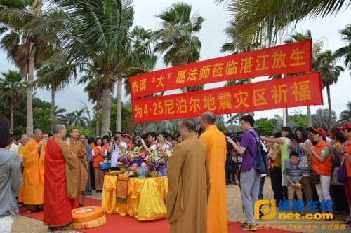 为祈愿众生平安喜乐,上午8时在广东省佛教协会副会长大愿法师带领下于湛江霞山渔港公园广场举行了盛大的放生仪式,并为“4.25尼泊尔地震灾区祈福”。