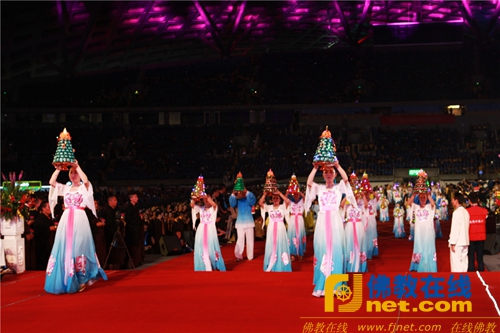 耀目的慈光,照亮古老的日晷。体育场中央,随着一声声金声玉振的引磬和法鼓声,来自中国大陆及香港、台湾、澳门地区的诸山长老,与泰国、斯里兰卡、柬埔寨、韩国、日本、美国、澳大利亚等多个国家的佛教三大语系的高僧大德,络绎登坛主法,诵经加持。