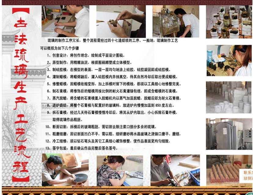 依设计图雕原始泥模——翻硅胶模——灌蜡模——细修蜡模围石膏模——加温脱蜡模——得耐火石膏模——秤配琉璃料——进炉烧制——拆石膏模——断面切割——粗磨——细磨——冷工细修——检验完成