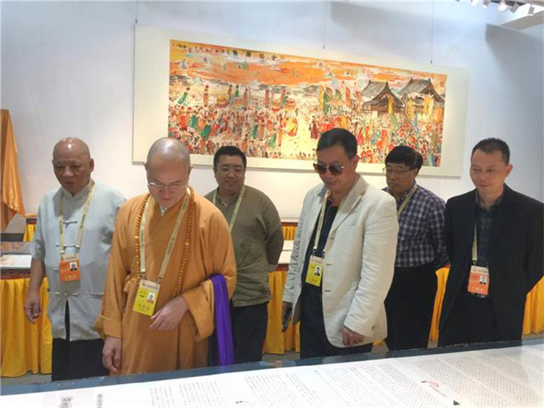 中国佛教协会副会长演觉(右3)、福建省民宗厅厅长黄进发(右1)驻足鉴赏《盛世经抄大典》手抄佛经艺术册页