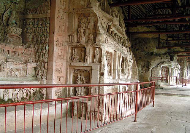 大足石刻 千手观音宝顶山:千手观音。大足时刻最具震撼力的作品,占岩面88平方米,刻1007只手,采取孔雀开屏式,各不相同,有序而