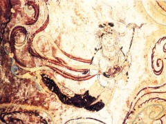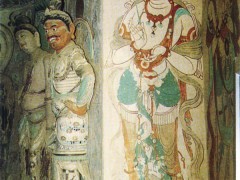 故事画是指在北魏晚期的洞窟里具有道家思想神话题材的壁画。西魏时期249窟顶部,除中心画莲花藻井外,东西两面画阿修罗与摩尼珠,南北两面画东王公、西王母驾龙车、凤车出行。