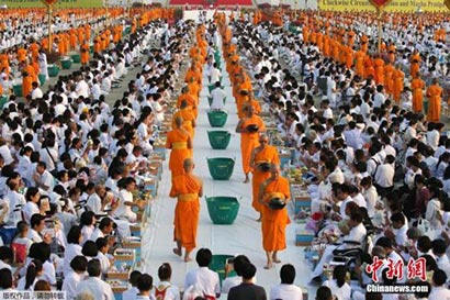 当地时间3月1日,泰国庆祝万佛节活动在巴吞他尼府举行,佛教僧侣在最大佛寺之一法身寺参加布施仪式(图片来源:中新网)