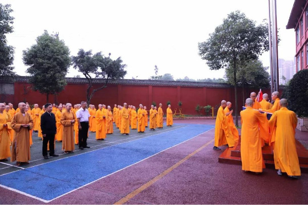 上午九点三十分整,进行毕业典礼第一项:升国旗、教旗仪式,这体现了四川尼众佛学院爱国爱教的优良传统。