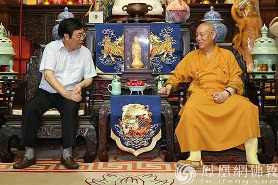 中国佛教协会副会长、舟山市政协、普陀山佛教协会会长、中国佛学院普陀山学院院长、普济禅寺方丈道慈大和尚与舟山市政协主席江建国一行亲切交谈(图片 摄影:普陀山佛教协会)