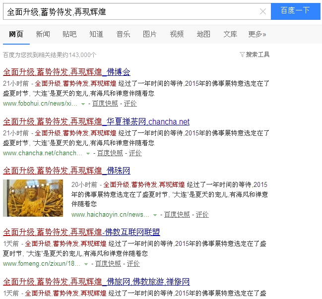 公元2015年7月5日周日,佛宝网的网络技术人员针对大连佛事展最近的新闻稿“全面升级,蓄势待发,再现辉煌”,做了技术处理后,全面发布到佛宝网多个频道和佛宝联网30家网站,图文并茂的展示大连佛事展的展会实力和品牌推广,7月6日工作日上午九点检测,百度全部收录,已经完全达到了“新闻稿霸屏”的效果,特收录截图如下: