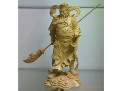 关羽(?-220)本字长生,后改字云长,河东解(今山西运城)人。东汉末年著名将领,自刘备于乡里聚众起兵开始追随刘备,是刘备最为信任的将领之一。在关羽去世后,其形象逐渐被后人神化,一直是历来民间祭祀的对象,被尊称为“关公”;又经历代朝廷褒封,清代时被奉为“忠义神武灵佑仁勇威显关圣大帝”,崇为“武圣”,与“文圣” 孔子齐名。长篇历史小说《三国演义》也对关羽的事迹多有描写,在《演义》中关羽被描写为“五虎大将”之首,毛宗岗称其为“《演义》三绝”中的“义绝”。○另外,古代有地名关羽,但其确切位置不明。 因为关羽做人做事,有始有终,恩怨分明,挂印封金,立场明辨,拒绝美女之诱惑,故在商场上与人合伙做生意时,都会请一尊关羽像,以示君子爱财取之有道,不背叛合伙人之意,加之后人神化,故而有武财神之意,所以中国史上有武财神赵公明关云长,文财神范蠡比干,而且中国封建史上有武状元,若取得武状元等于高官侯爵,所以商人也示关羽为财神之意。 在中国传统民间观念中,认为财神是掌管天上财富的神。而关公被中国民间奉为武财神。还有一位是黑口黑面的赵公明。关羽形象威武,不但忠义感人,而且据说还能招财进宝。摆放武财神时,应面向屋外,或朝向大门。一方面可以招财进屋,同时又可镇守门户,阻挡外邪。 韦驮菩萨 韦驮菩萨现天大将军身时,为四天王座下三十二将之首,也是大家所熟悉的佛教护法神。 中国佛教寺院中,韦驮菩萨像常威武地立于最靠近寺院门口的四天王殿内,面向著寺院,以守护伽蓝(即道场之意)。其形像大多为身穿甲胄的雄壮武将,手持金刚杵,或以杵柱地,或双手合十,将杵搁于肘间。 韦驼菩萨现天大将军身,担当佛教中驱除邪魔,保护佛法的重任,为佛教中护法金刚力士的代表之一。 相传,浙江临安东天目山是韦驮菩萨的道场。 本店其他作品风采